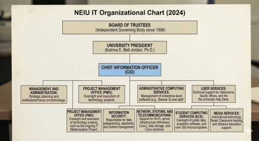 The organizational chart below was reconstructed from publicly available institutional data on NEIU's current structure. It illustrates the unified, CIO-led University Technology Services that evolved from the foundational reorganization begun in 1995.