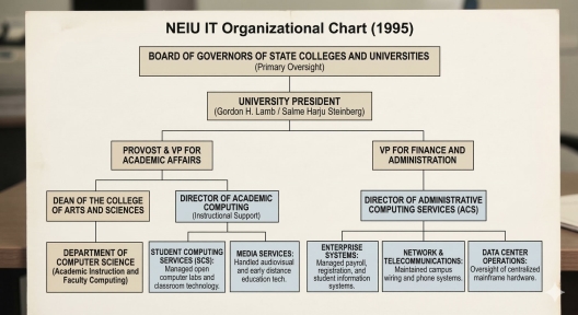 In 1995, NEIU's information technology was not a unified function. It was a collection of competing units, each with its own reporting lines, its own budget, and its own territorial interests. My position — Director of Academic Computing — reported to the Provost and VP for Academic Affairs. The Director of Administrative Computing Services reported entirely separately, to the VP for Finance and Administration. Network and Telecommunications, Media Services, and Data Center Operations each had their own structures. There was no Chief Information Officer. There was no unified governance. There was, in the language of my 1989 CAUSE paper, significant institutional entropy.