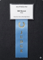 Invited by the Judging Committee (RyAnn Nelson, Tom Unger, Tony San Agustine) to judge the Area 19 Science Fair at Kelvyn Park High School, 4343 West Wrightwood Avenue. Dr. Moressi submitted a completed RSVP Judge Information Sheet, listing his affiliation as NEIU (Retired) and selecting Computer Science and Health Science as his preferred judging categories. In response to how many times he had judged the fair, he wrote: “About 5 or 6 times.” In response to how he first heard of the fair, he wrote: “My son was a participant.” The credential badge and Judge ribbon shown above is from this event.