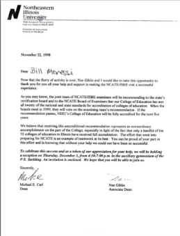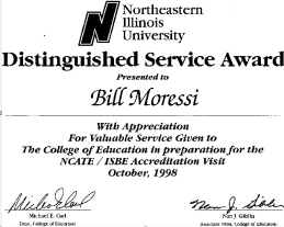 In November 1998, Dean Michael E. Carl and Associate Dean Nan Giblin of the College of Education wrote personally to acknowledge the role of Bill Moressi in achieving full NCATE/ISBE accreditation — one of only a handful of Illinois colleges of education to receive unconditional recommendation. This was accompanied by a formal Distinguished Service Award.
