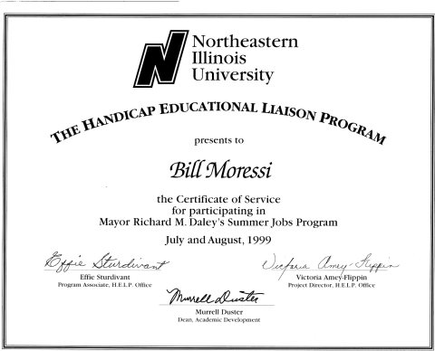 In 1999, the Handicap Educational Liaison Program at NEIU presented a Certificate of Service for participation in Mayor Richard M. Daley's Summer Jobs Program, July and August 1999.