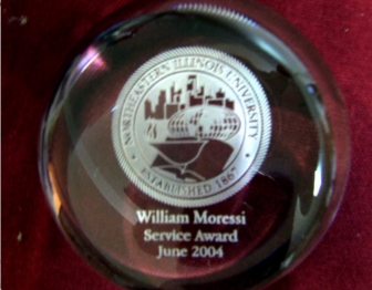 Northeastern Illinois University crystal Service Award — engraved "William Moressi, Service Award, June 2004."